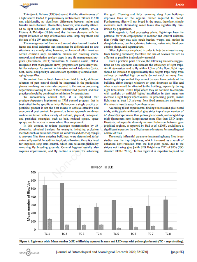 Согласно результатам исследования, уф-ловушки с клеевыми пластина белого цвета могут использоваться в программах комплексной борьбы с вредителями (IPM) для мониторинга и контроля мух как на животноводческих фермах, так и на предприятиях пищевой промышленности. При использовании клеевых пластин белого цвета повышается скорость отлова насекомых и кол-во отловленных летающих насекомых. Что в итоге позволяет снизить риск распространения патогенных микроорганизмов переносимыми мухами.