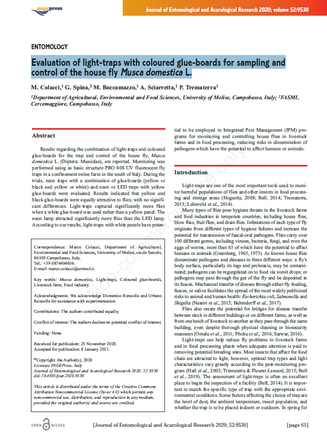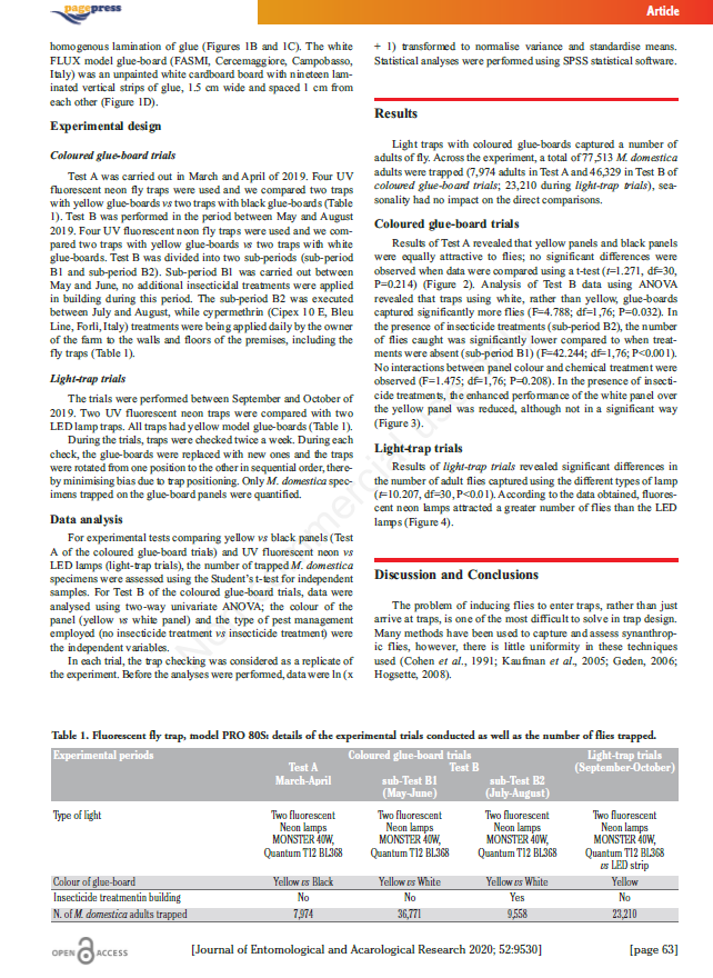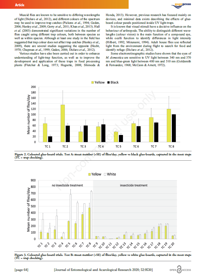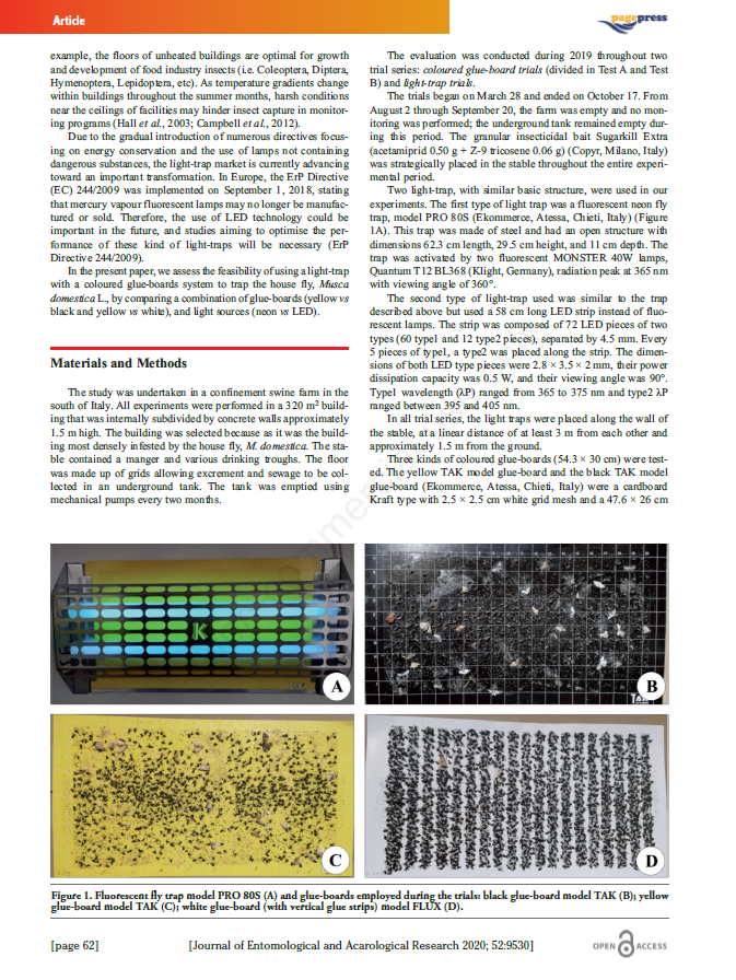 В статье опубликованы результаты исследований, касающиеся комбинации уф-ловушек, источников света установленных в них и клеевых пластин разных цветов для отлова домашней мухи (Musca domestica).